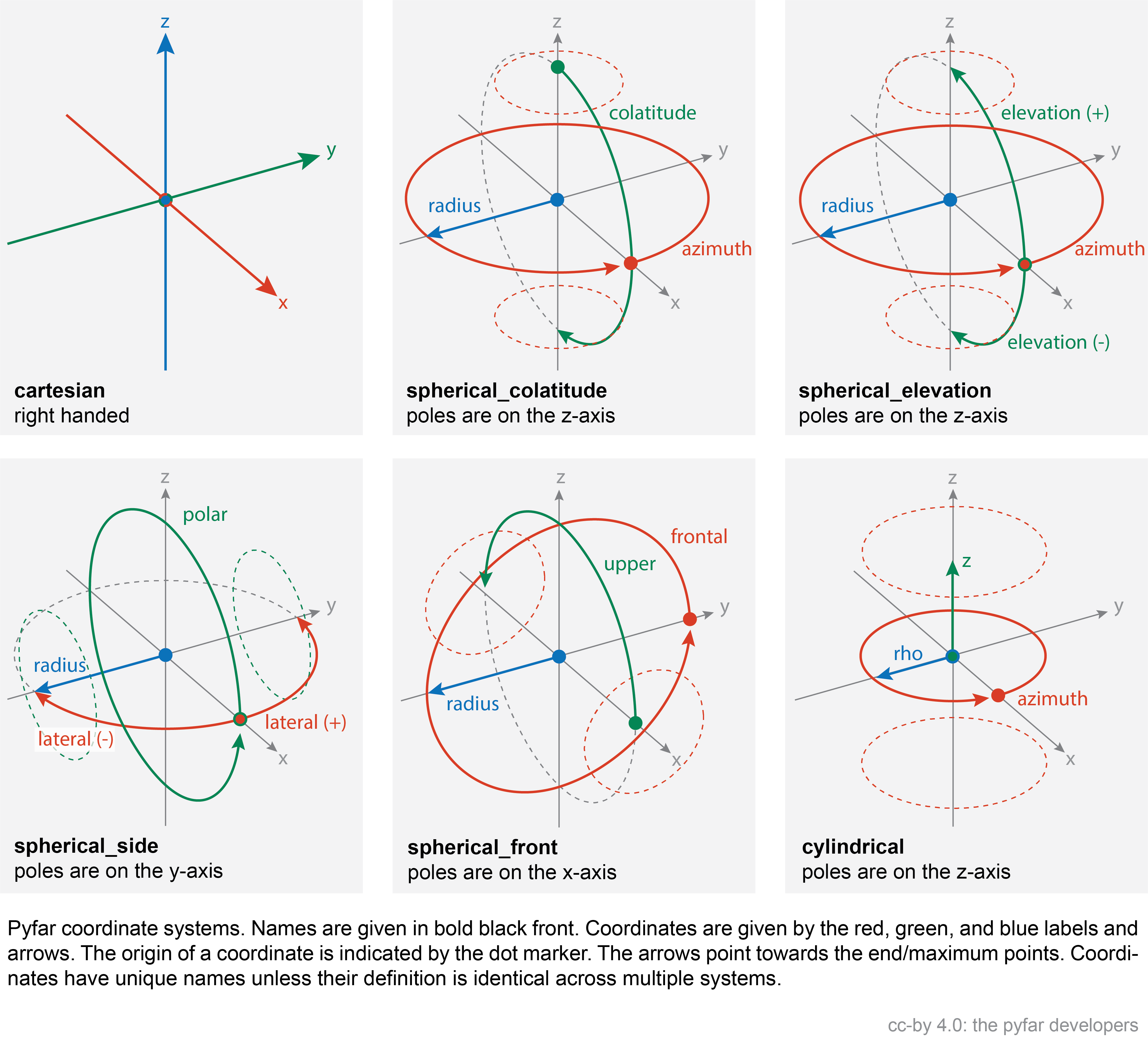 Each coordinate system has a unique name, e.g., spherical_elevation, and is defined by three coordinates, in this case azimuth, elevation, and radius. The available coordinate systems are shown in the image below.